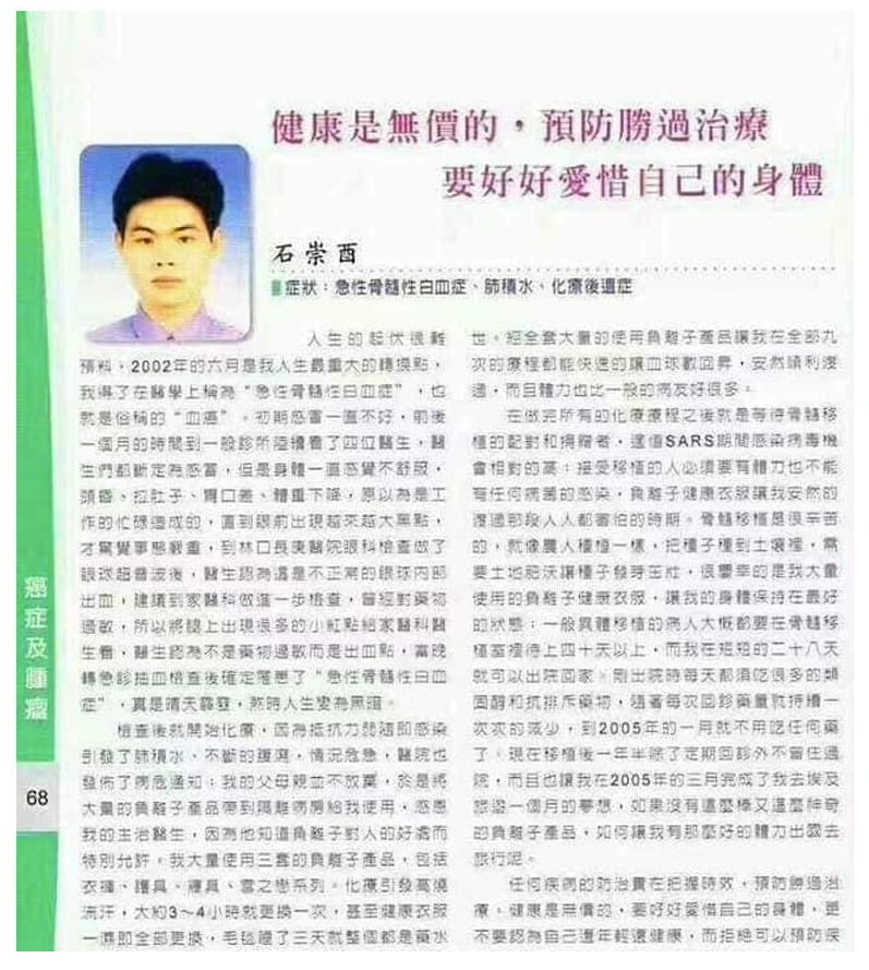 在做完所有的化疗疗程之后就是等待骨髓移植的配对和捐赠者,适时SARS期间感染 病毒机会相对的高,接受移植的人必须要有体力也不能 有任何病菌的感染,负离子健康衣服让我安然的度过那段人人都害怕的时期。