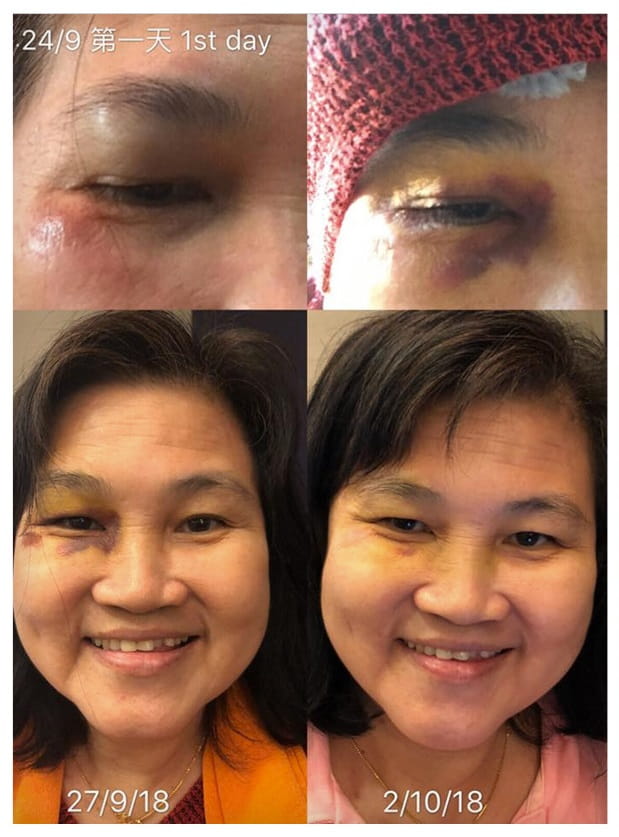 金赞在中秋节(24/9)过马路时不小心跌倒,当下脸颊骨摩擦马路,过后眼睛开始淤青。回到家马上把负离子的围巾包上,每天晚上把被毯胸垫加量放在眼睛伤处加上帽子。几天后淤血散开,一个星期后眼睛淤青部分好了90%