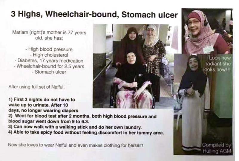 馬來西亞夥伴mariam的妈妈77岁高龄,有高血压、胆固醇高、糖尿病、坐轮椅2.5年、胃溃疡。