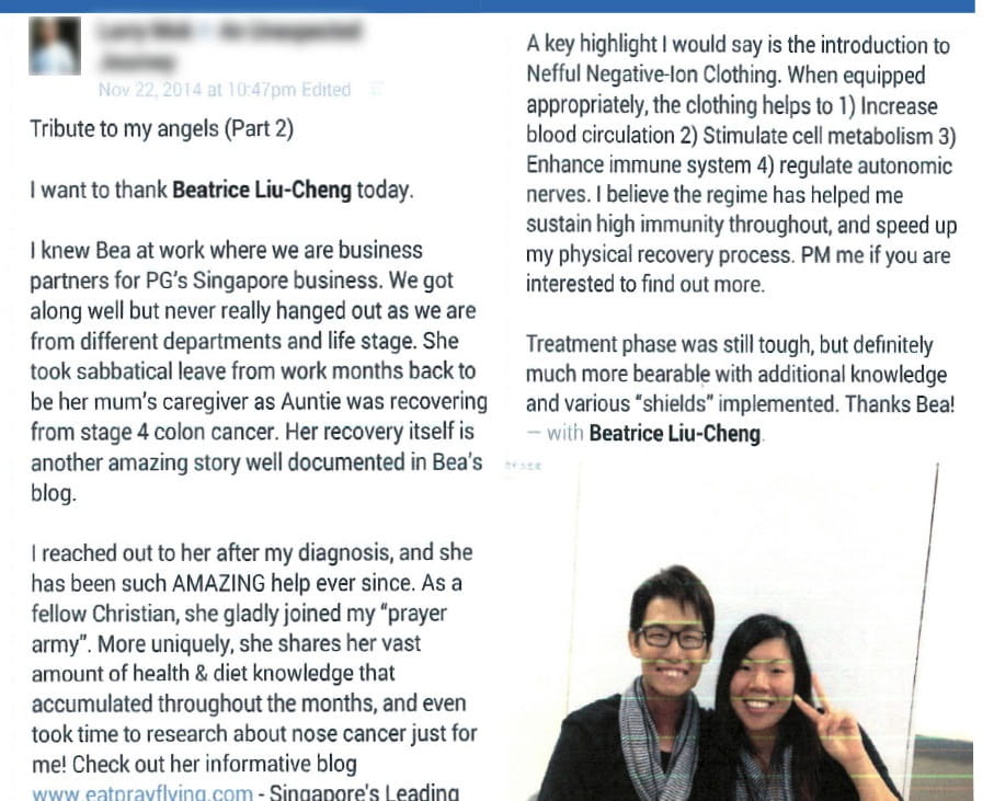 At first, he was very stubborn and reluctant to try. His perception changed only after hearing so many stories about how chemotherapy affects the mental state of the other cancer patients. He then bought a full set of Negative Ion clothes to kickstart his journey to combat cancer.